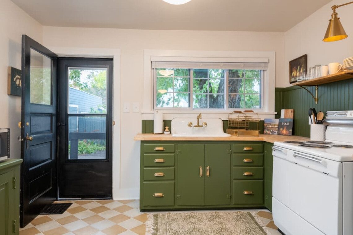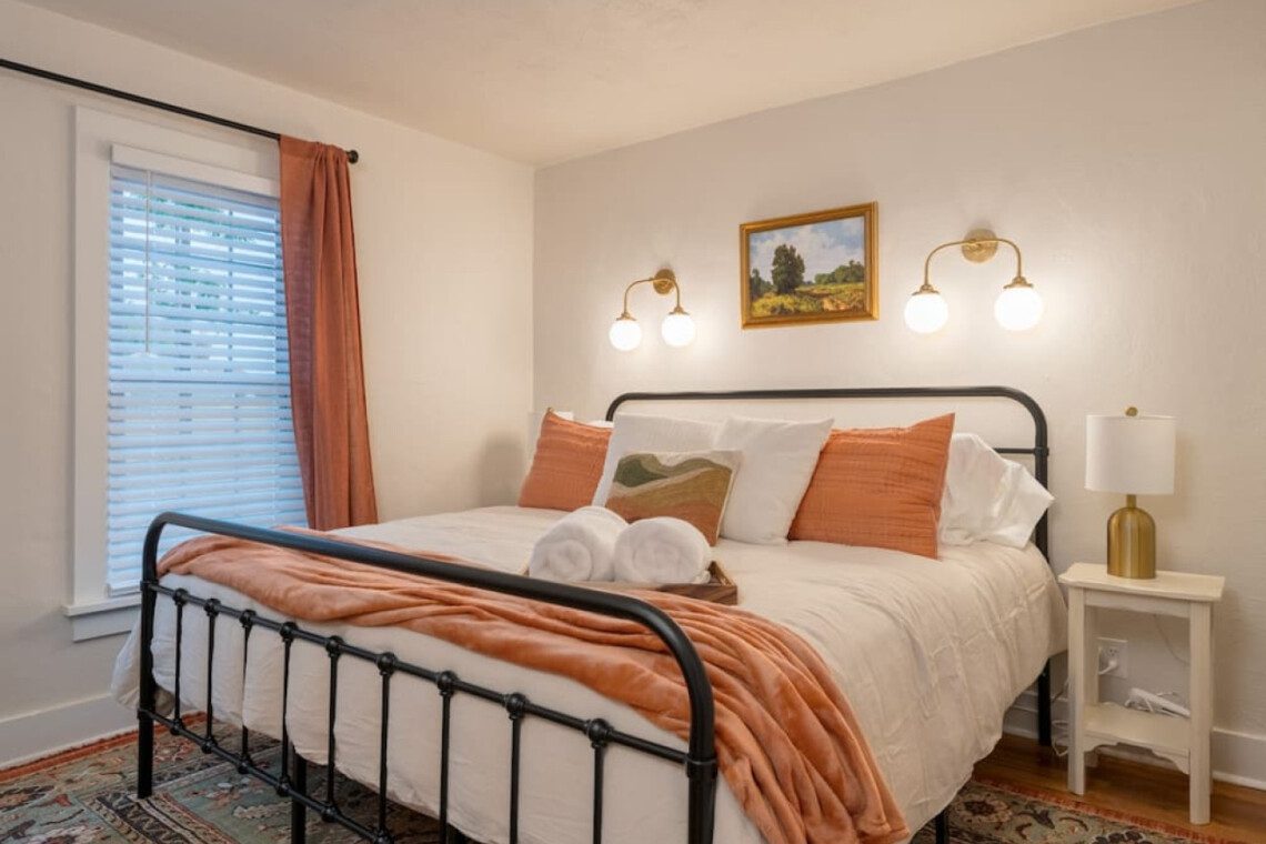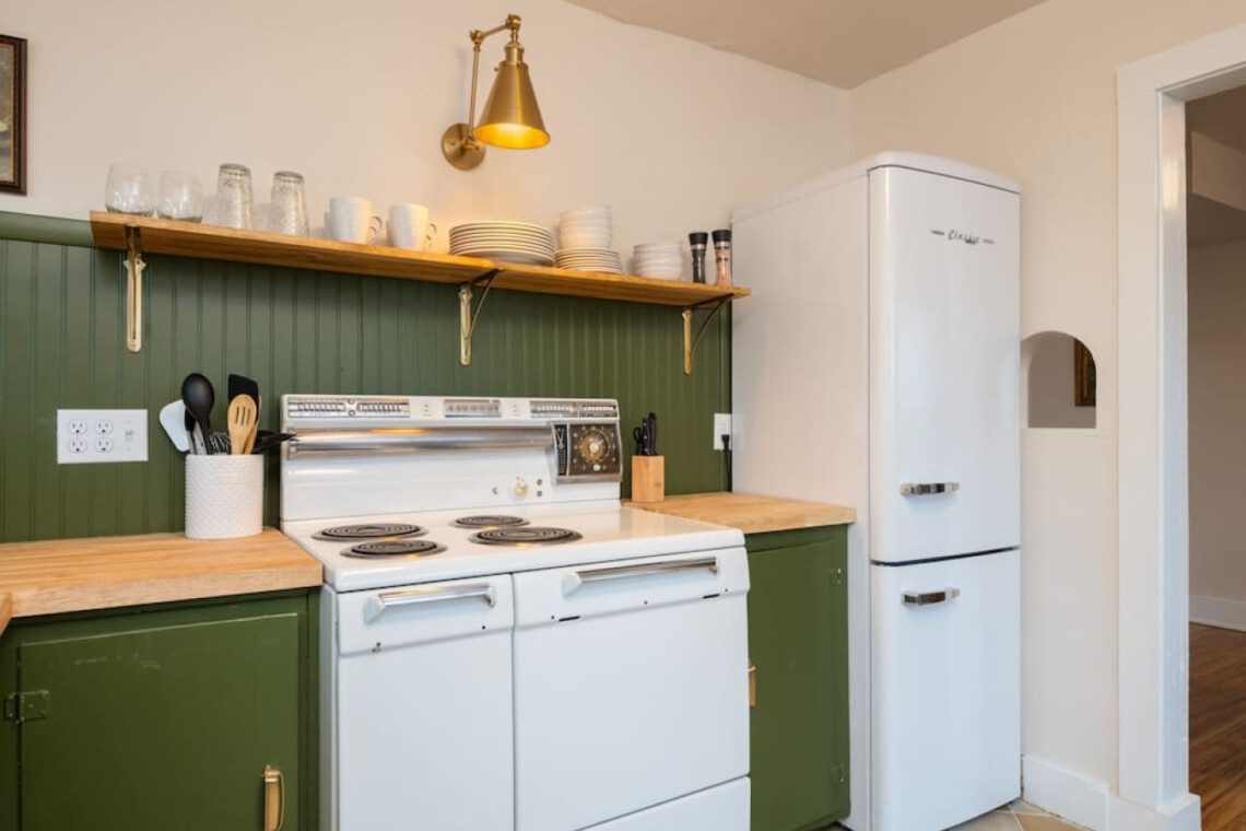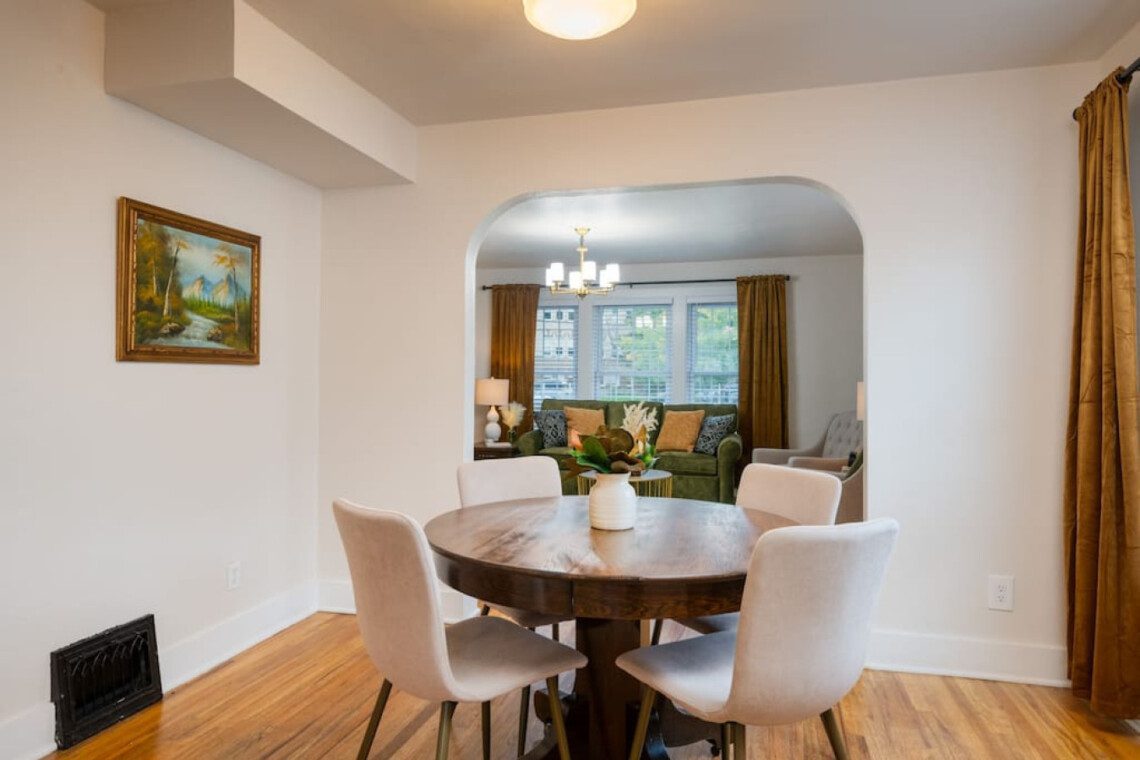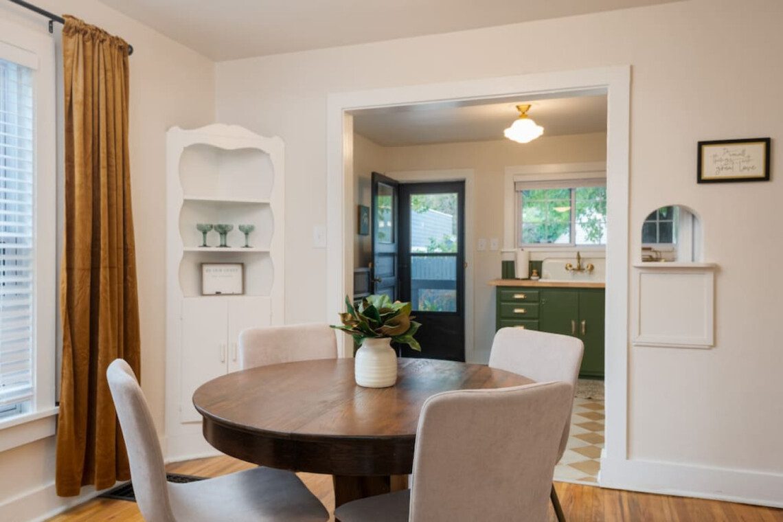 The space is nice and roomy and has generous sized rooms. The living room is a large comfortable space that is very light filled. It leads into the dining room area, which is such a sweet and cozy spot. The kitchen is full of vintage vibes and beautiful new tile and countertops. You will love the retro looking refrigerator and the authentic vintage stove. We placed a king size bed in the bedroom and it creates such a serene environment. We also sourced beautiful tile for the tub and shower and newly remodeled bathroom. We hope you love your time here!