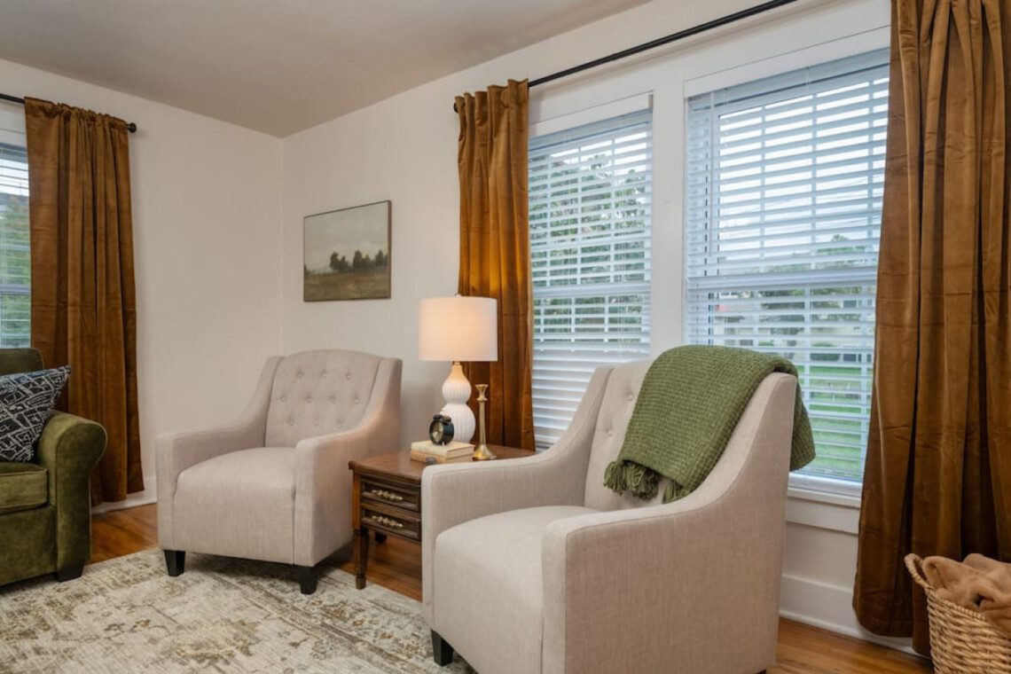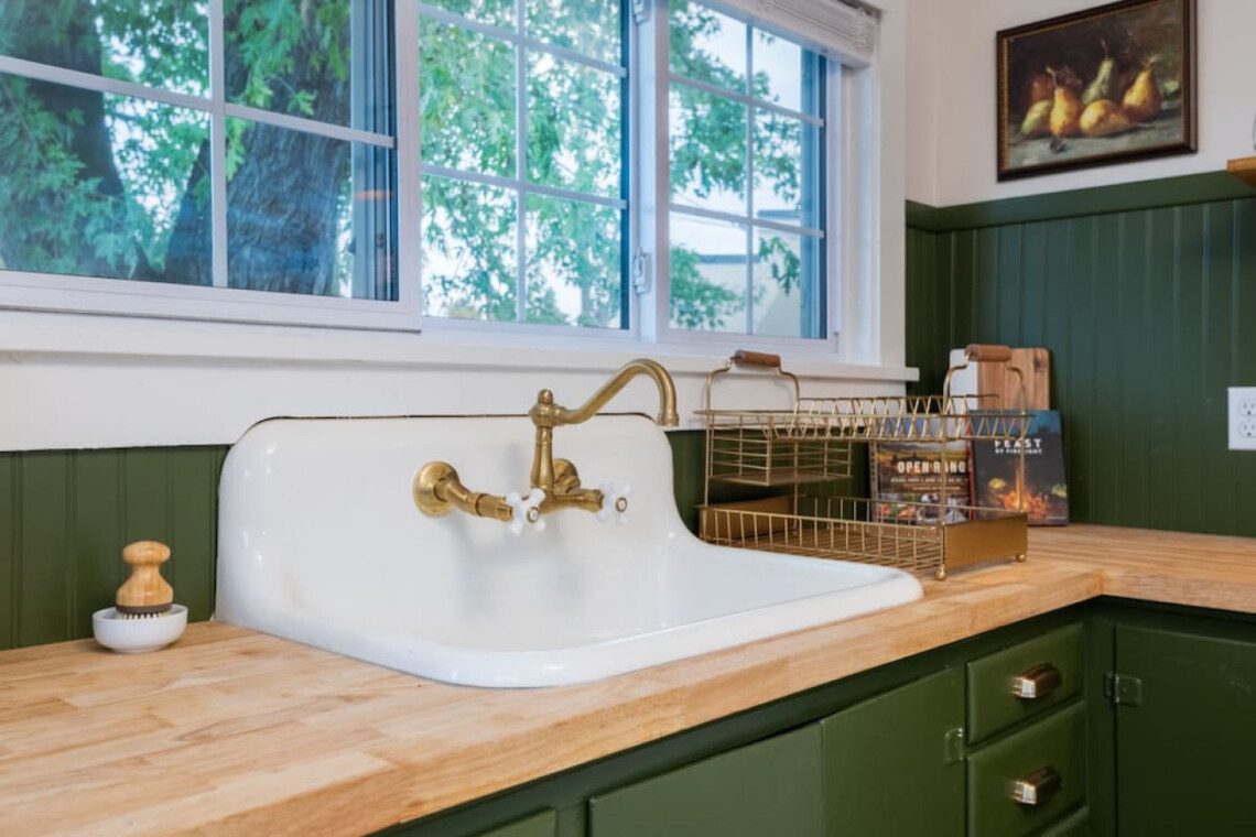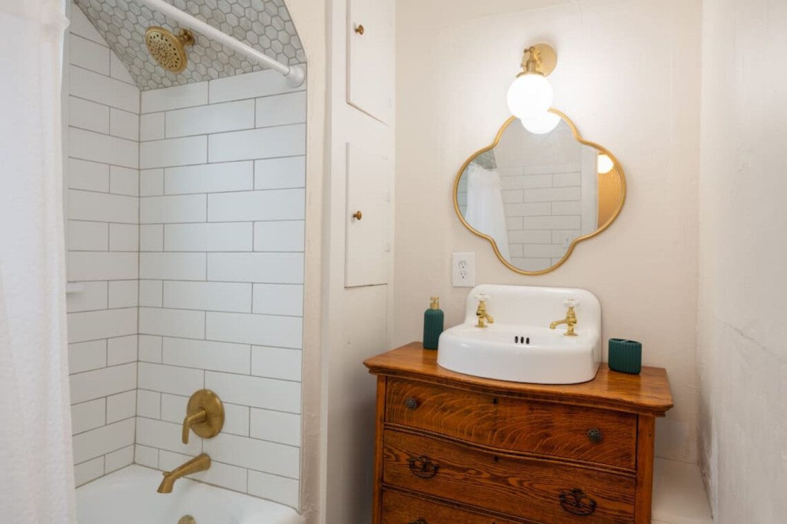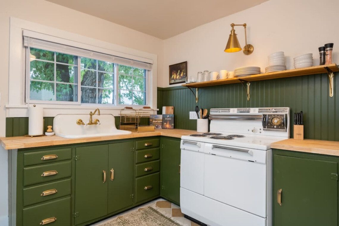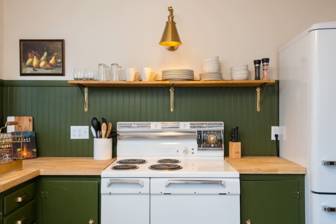 The space is nice and roomy and has generous sized rooms. The living room is a large comfortable space that is very light filled. It leads into the dining room area, which is such a sweet and cozy spot. The kitchen is full of vintage vibes and beautiful new tile and countertops. You will love the retro looking refrigerator and the authentic vintage stove. We placed a king size bed in the bedroom and it creates such a serene environment. We also sourced beautiful tile for the tub and shower and newly remodeled bathroom. We hope you love your time here!